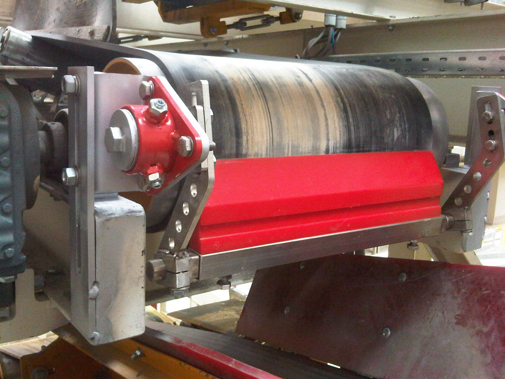 Secundärabstreifer BASIC LINE mit konvexer Abstreifleiste besetzt mit Sinter Hartmetall in Vordosierung für Asphalt Zuschlagstoffe.